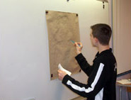 C'est lors de cette deuxième séance que sont apparues avec évidence les différences de postures adoptées pour le dessin sur petit format en extérieur et pour ce grand format dans la salle de classe. Les élèves ont essentiellement mis en jeu leurs seuls doigts et mains lors du premier exercice, alors que beaucoup d'entre eux se sont investis physiquement tout entiers dans le deuxième. Nous avons pu apprécié également la différence de qualité de trait qui en résulte.