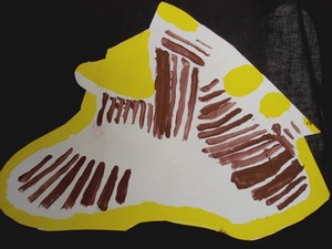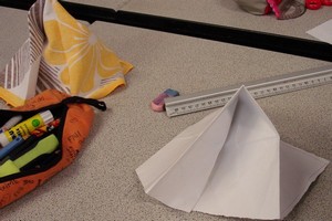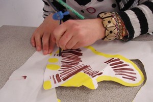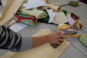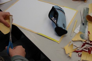 Le choix du ou des papiers est assez rapide. Plusieurs élèves se lancent dans des brouillons en testant le papier. On l'use, le gratte, le pique, le mouille, le froisse. Une autre partie de la classe essaye de reproduire le motif, de retrouver la forme avec la pliure, d'imiter les couleurs.
