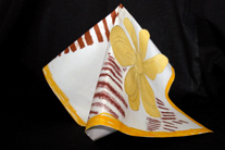 Une serviette de table colorée et à motifs est posée sur chaque table. Elle est pliée mais ouverte, mise en volume.