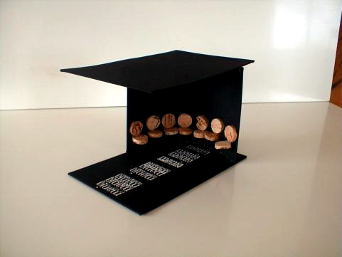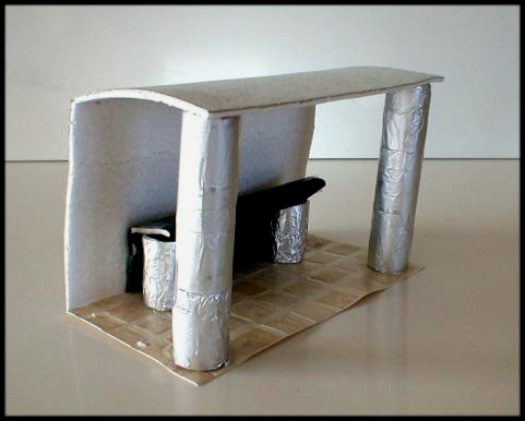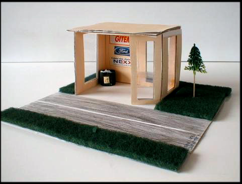 "J'ai trouvé la forme en observant de vrais abribus. Pour la maquette j'ai utilisé des cartons recouverts de tissu noir, destinés à l'emballage d'un parfum d'un grand couturier. Cela donne un côté chic. Pour le sol j'ai utilisé un carton où est inscrit la marque du parfum en blanc sur noir. Souvent il y a des publicités dans les abribus. Dans celui-ci, la pub est sur le sol, ce n'est pas commun. Ce carton a été récupéré dans une entreprise qui fait du marquage publicitaire. Ce sont des cartons " ratés ". Le marquage a dérapé, les lettres se chevauchent cela crée un effet plastique qui m'a intéressé. J'ai compris qu'un abribus ce n'est pas seulement quelques bouts de plastique et de tôle mis les uns à côté des autres. Il faut rechercher des matières, des formes intéressantes."