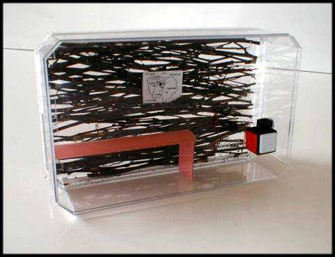 - matériaux de la maquette : calque translucide jaune, bouchons de parfum en plastique, carton, tubes en plastique transparent, bois (banquette intérieure), fil de fer