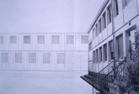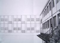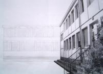 "J'ai essayé de reprendre quelques éléments du vieux bâtiment comme les portes et les gouttières pour ne pas que cela choque. J'ai fait des fenêtres qui n'ont pas la même largeur. En haut ça fait large/ large - large - étroit / large / étroit - large - large..." Eva L.