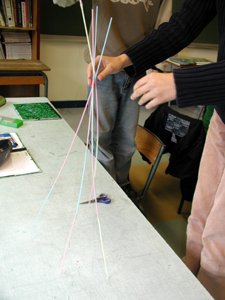 J'ai dans un premier temps repris la leçon telle quelle en proposant quinze pailles par équipe de deux élèves. Cela leur permettait difficilement de réaliser des constructions suffisamment larges pour être transparentes. En outre, les élèves de 5ème, plus intéressés par la compétition de la hauteur, ne se posaient pas trop la question de la transparence. Celle de la stabilité était par contre cruciale.