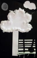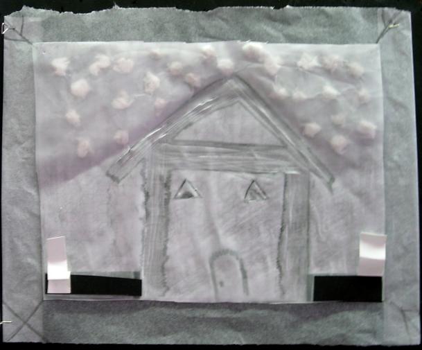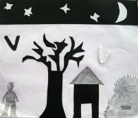 "Pour pouvoir utiliser ce que j'avais appris, je n'ai pas fait tout le fond noir, seulement le ciel, parce que je voulais montrer que c'est la nuit. En faisant le reste du fond blanc j'ai pu faire des frottages, car cela m'avait bien plu et comme cela l'arbre et la maison étaient bien visibles."