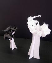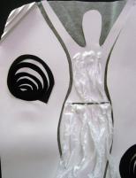 "Je me suis inspirée de l'oeuvre d'Henri Matisse "le lanceur de couteau", ensuite comme la femme semblait danser, je voulais donner autour d'elle un aspect de fête. Une danseuse porte toujours un costume, alors j'ai pris du papier de soie pour le réaliser. Le papier de soie est idéal pour mon travail parce que j'ai pu le froisser pour faire le vêtement, j'ai utilisé une autre feuille non-froissée pour faire ressortir le personnage. Le papier canson, grâce à sa rigidité maintient le papier de soie."