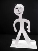 "J'ai décidé de faire un bonhomme, et pour le faire tenir je lui ai fait quatre jambes et un socle. Ensuite j'ai voulu lui faire un côté sympa et un côté méchant. J'ai pris du papier canson pour le bonhomme et le socle car c'était plus solide , donc ça pouvait tenir debout. J'ai choisi du papier de soie car c'était facile à froisser pour les cheveux et aussi faire des bouclettes."
