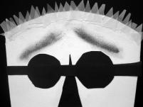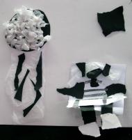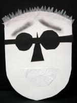 "J'ai essayé d'utiliser toutes les sortes de papier qu'on avait pris dans les autres sujets. Le noir faisait bien ressortir le nez et les lunettes sur le fond blanc. Pour la bouche j'ai pris du papier de soie, il peut prendre la forme que l'on veut. Pour les cheveux, j'ai pris le papaier calque pour changer de couleur."