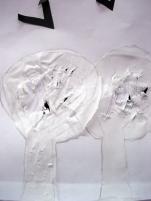 "J'avais envie de faire quelque chose en volume et d'utiliser l'idée que l'on peut faire tenir des papiers ensemble sans les coller, comme dans le sujet avec le socle.Le papier canson convenait bien pour faire le tronc de l'arbre, car il est suffisamment solide pour rester debout et soutenir les feuilles. Les feuilles sont en papier de soie et ne sont pas collées, elles tiennent entre les branches parce qu'elles sont légères. En prenant des papiers noirs et blancs j'ai pu faire un contraste entre les 2 arbres."