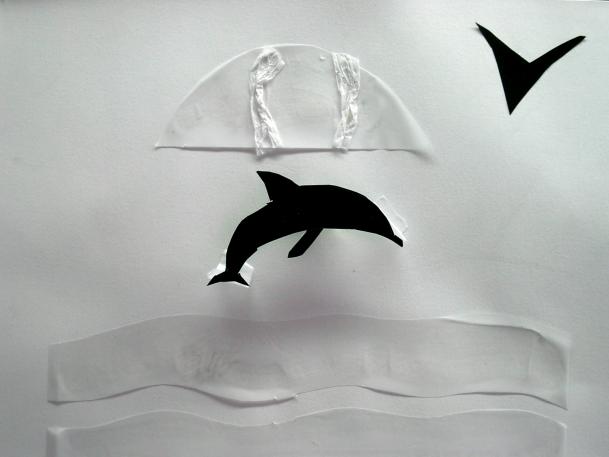 "L'idée m'est venue car j'adore les dauphins. J'ai fait des vagues pour montrer qu'il est dans l'eau et j'ai mis le dauphin en relief pour donner une impression qu'il saute hors de l'eau. J'ai fait le dauphin en noir pour qu'il ressorte sur le blanc et donner une impression vraie."