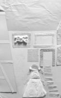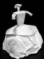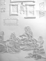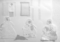 Mon idée était d'amener les élèves à ne pas considérer uniquement le papier en tant que support mais aussi en tant que matériau. Un matériau qu'ils utilisent et expérimentent régulièrement et dont nous avons déjà ici et là évoqué les qualités plastiques. Créer des figures avec un papier blanc sur un support blanc pose bien évidemment les questions de contours et de limites. Le papier en fonction de son épaisseur et de sa qualité va réagir à la lumière d'une certaine façon et proposera ainsi une gamme de blancs assez variés. Le blanc va devenir matériau grâce aux effets de la lumière. Comment produire un travail qui fera référence aux Ménines mais dans lequel tout sera blanc ! et par conséquent, comment créer des formes qui vont avoir la même gamme colorée que le fond ?