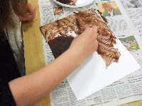 Avec cette proposition je souhaitais que les élèves s'interrogent sur l'épaisseur de la pâte/peinture, les traces laissées par le geste et la pression de la main.