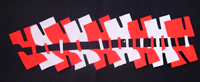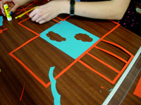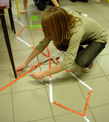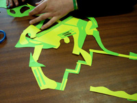 Les réalisations ont ensuite été mesurées et photographiées car leurs grandes dimensions ne permettaient pas l'affichage pour la verbalisation. Celle-ci s'est faite le cours suivant à partir des photos projetées, l'objectif étant de repérer les principes exploités. Puis chaque élève a rempli une fiche où il : - a coché les mots de vocabulaire qui correspondent à son travail. (liste établie collectivement lors de la verbalisation au vu des réalisations) - a utilisé ces derniers pour décrire sa réalisation, la photo de celui-ci y étant associée.