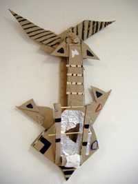 Lors de cette première séance, l'idée de donner du volume arrive au centre des débats lorsque chaque petit groupe s'approprie le carton et la ficelle mis à disposition. Le matériau impose d'autres façons de penser la forme. On plie, on découpe, on incise, on creuse, on colle, on agrafe, on enlève, on ajoute, on associe, on noue, on attache...on décompose l'objet connu pour fabriquer sa guitare !