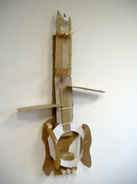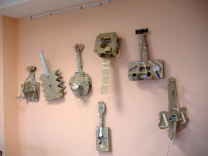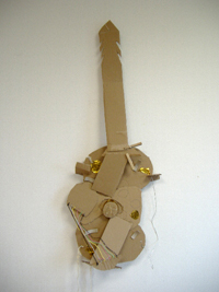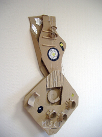 Pour la seconde séance, certains élèves ont rapportés des matériaux qu'ils souhaitent associer à leur production : rouleaux de carton et bouchons de liège accentuent ainsi la ressemblance avec certaines formes de l'instrument de musique. De plus, il est mis à leur disposition des bâtonnets de bois quelques petits fils de fer. Le travail est relancé : on fait ressortir des formes et ici et là, on défait toute ressemblance avec une caisse à corde, on joue sur l'équilibre, le manche s'allonge et les cordes se tendent. La guitare se fabrique morceaux par morceaux et se révèle parfois surprenante dans ses formes. L'instrument connu devient un objet incongru !