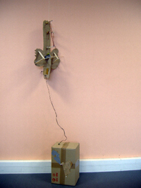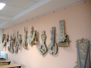 Les volumes sont présentés dans une salle voisine qui permet un accrochage global. La verbalisation est assez rapide car les discussions concernant les questions du sujet ont eu lieu lors de chaque séance. Il s'agit de faire le bilan. On parle d'une présence sur le mur. De quelque chose de physique. Les élèves disent le relief, des "choses qui sortent du fond", et évoquent l'idée du volume. Une guitare est posée au sol mais elle ne tient pas bien : une question d'équilibre. Un autre groupe a improvisé un ampli avec une carton à peine retouché. Ce carton pourrait servir de socle, et on parlerait alors de sculpture.