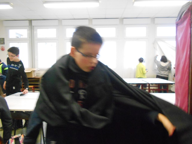 Après la lecture de l'incitation, les groupes se forment. Sans intentions, un groupe décide d'utiliser un paravent, un drap noir. Les élèves essaient différentes choses, s'amusent de façon inefficace. Il me faut recadrer leur comportement. Ils justifient leurs éclats de rire et leur brouhaha : ils souhaitent travailler sur le mouvement mais ne parviennent pas à se mettre d'accord. A la séquence suivante, nous regardons ensemble les photographies prises. Ils doivent auto-évaluer leur travail : les images ne se ressemblent pas vraiment et puis surtout ils trouvent que "c'est nul! On voit tout ce qu'il y a derrière!".