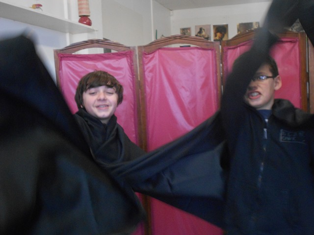 Les élèves multiplient alors les essais. Ils décident d'installer le drap comme fond. Deux photographies seront alors les déclencheurs de leur projet, ils les trouveront plus amusantes et plus intéressantes que les autres. Le cadrage est alors resserré sur le visage du modèle grimaçant et la prise de vue se fait en mouvement. Le modèle doit porter un haut noir ou s'enrouler dans un drap noir. Le processus de création est enclenché...