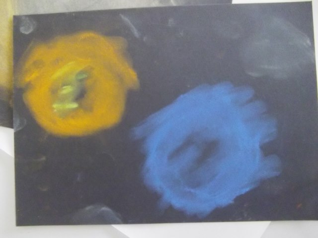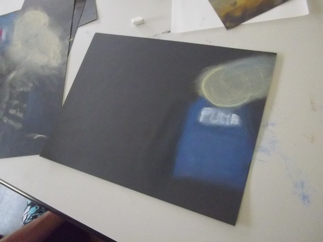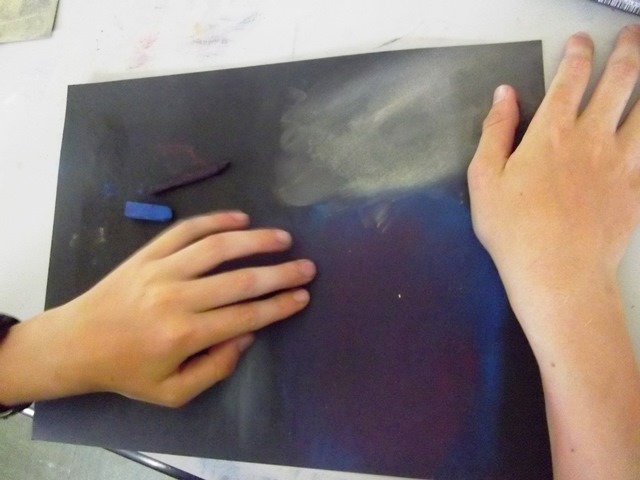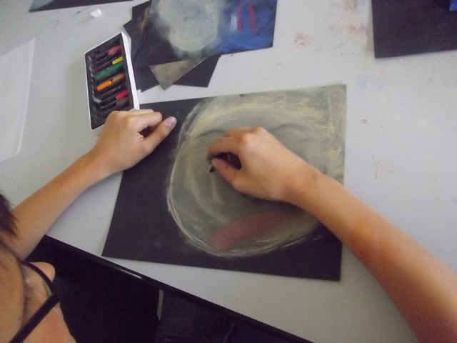 L'appareil photo devient alors un outil graphique. La séquence suivante propose aux élèves de continuer leur série mais sans appareil photo numérique avec des outils traditionnels : fusains, pastels secs et gras, gouache, crayons, papiers de couleurs. Les élèves ont au cours de séances précédentes eu l'occasion d'utiliser ces techniques. Le groupe demande des pastels et des feuilles de papiers noir. De nouveaux essais commencent. Les élèves comparent leurs images, trouvant que tel effet est bien réussi sur tel travail, que sur tel autre il faudrait peut-être faire plutôt comme cela. Le travail en équipe est alors une évidence, les élèves enrichissent leurs propres réalisations par les découvertes des autres; les images se construisent ensemble.