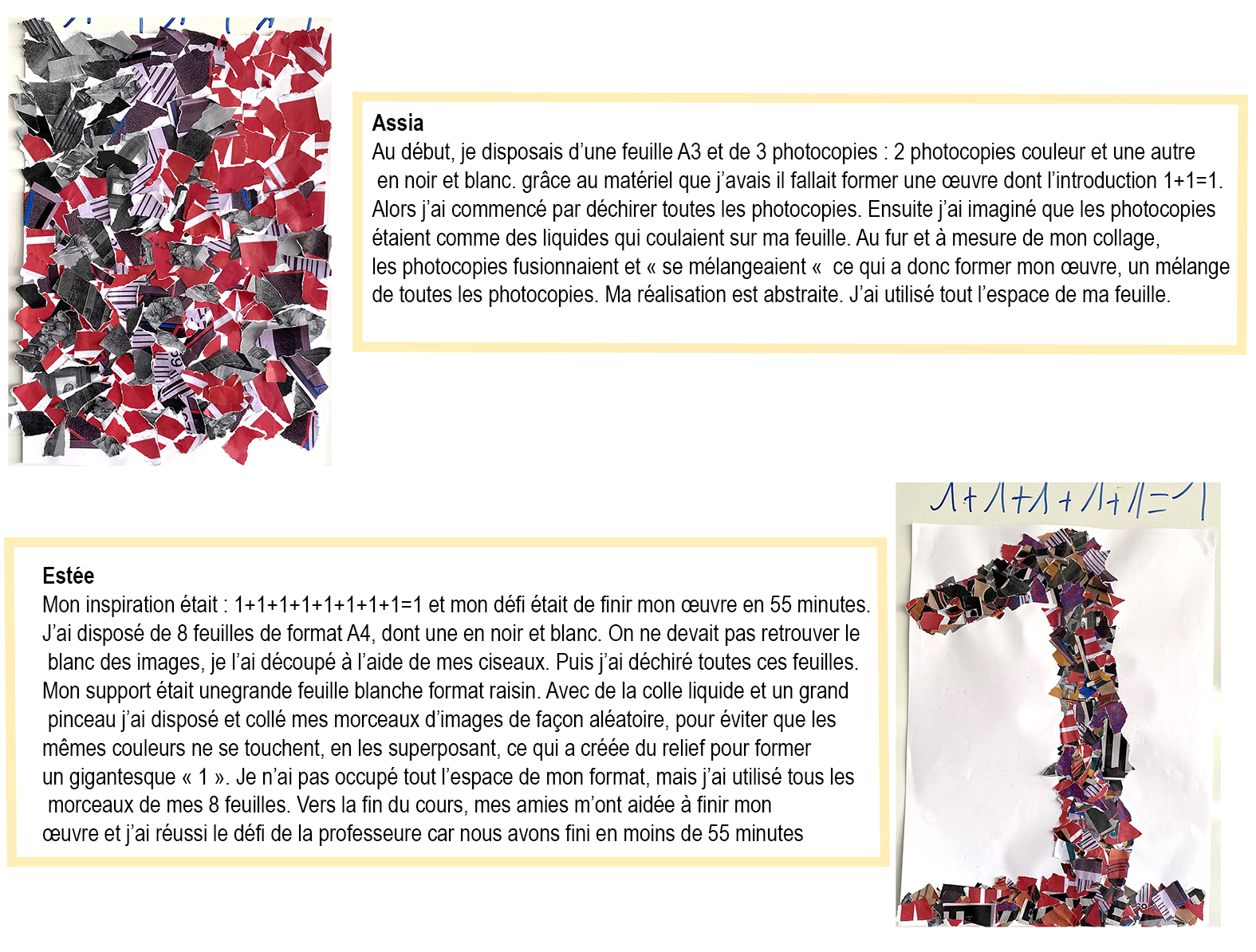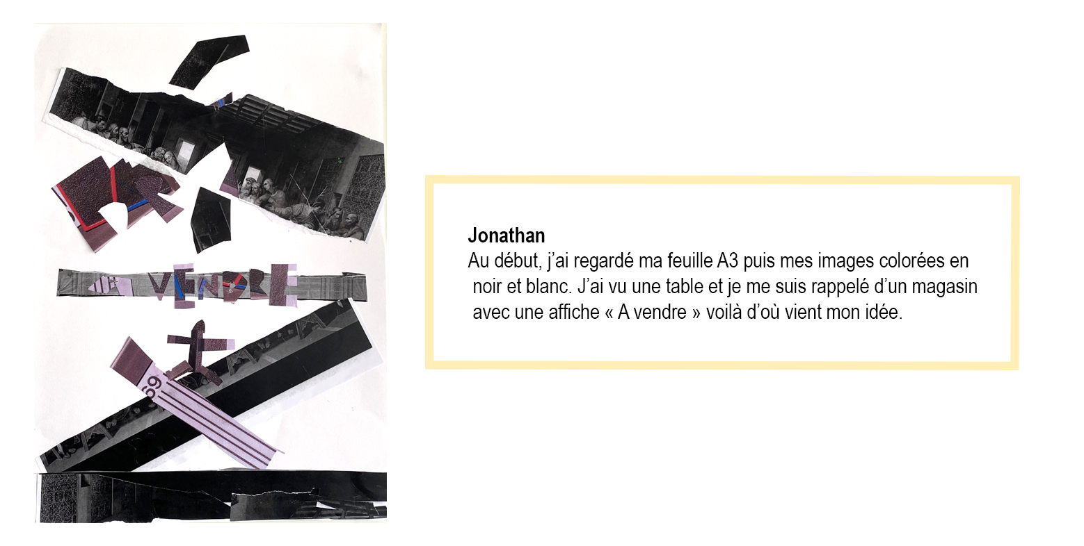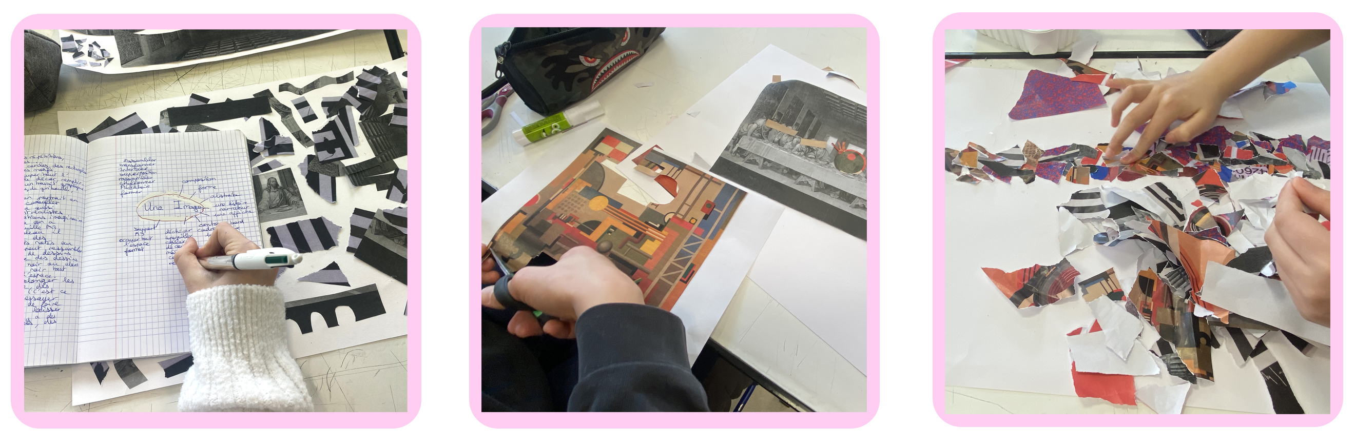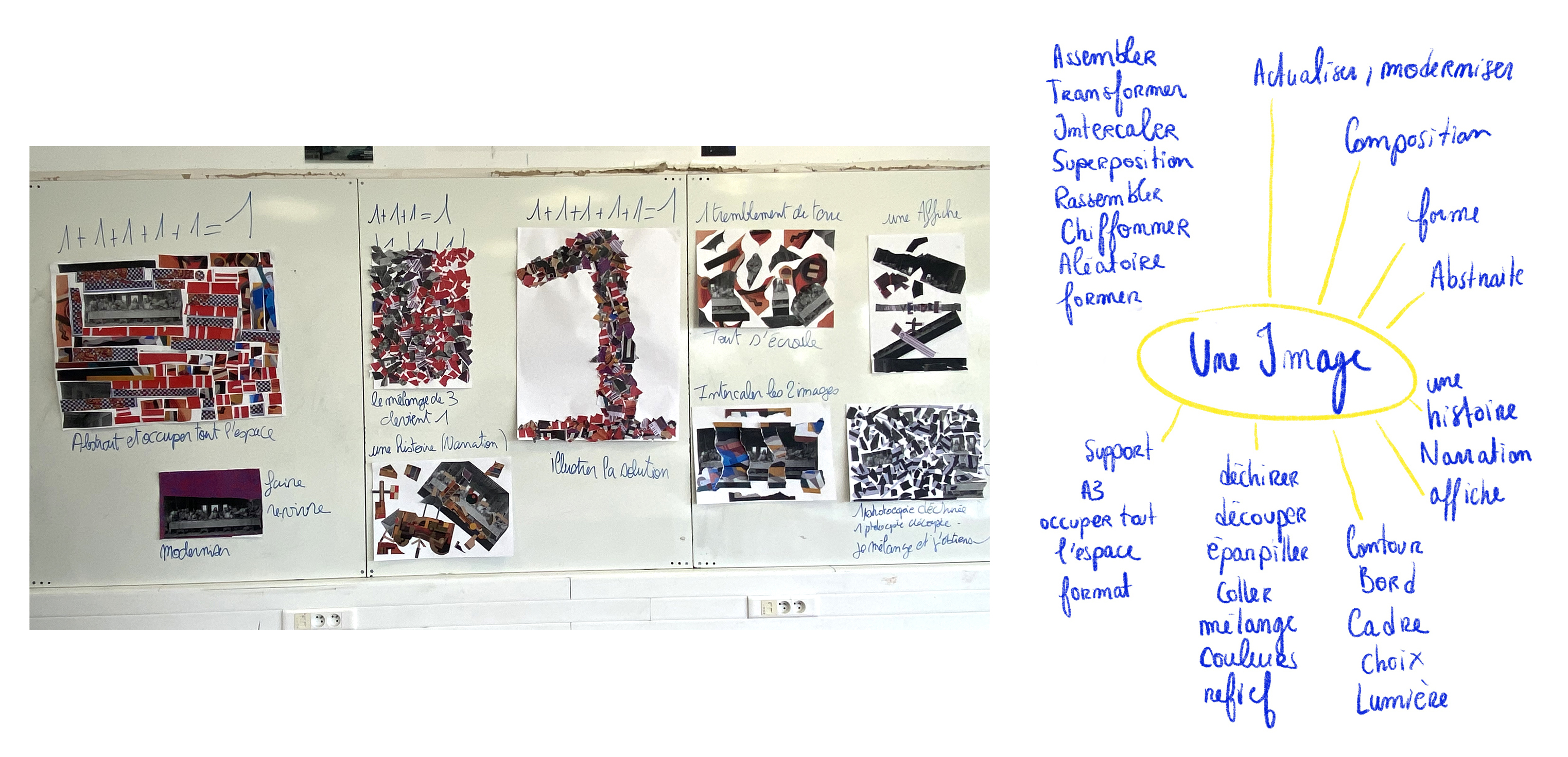 Des termes spécifiques apparaissent spontanement au cours des échanges : image, assemblage, intercaler, juxtaposer, narration, occupation de l’espace, abstraite, affiche, superposer, actualiser, moderniser, composition.