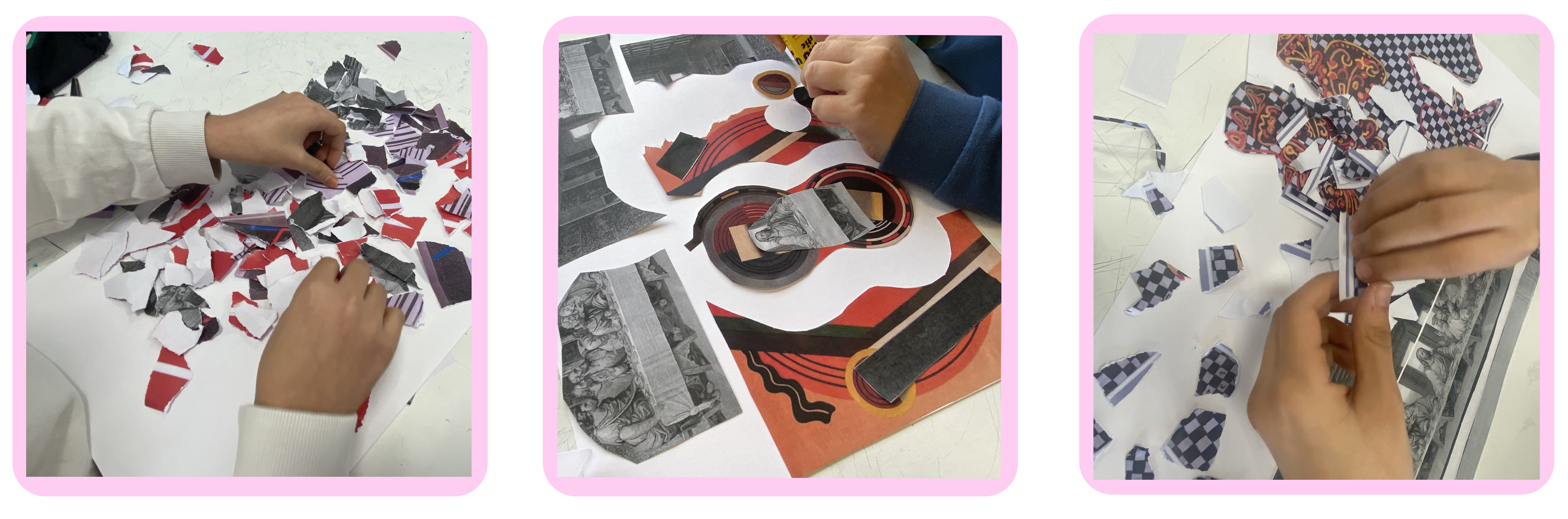 Le démarrage est rapide, certains s'emparent des photocopies et découpent directement de façon aléatoire des bandes, d’autres plus posés, regardent les deux images, les comparent, les dissocient, les rassemblent, d'autres se laissent un temps de réflexion plus long.