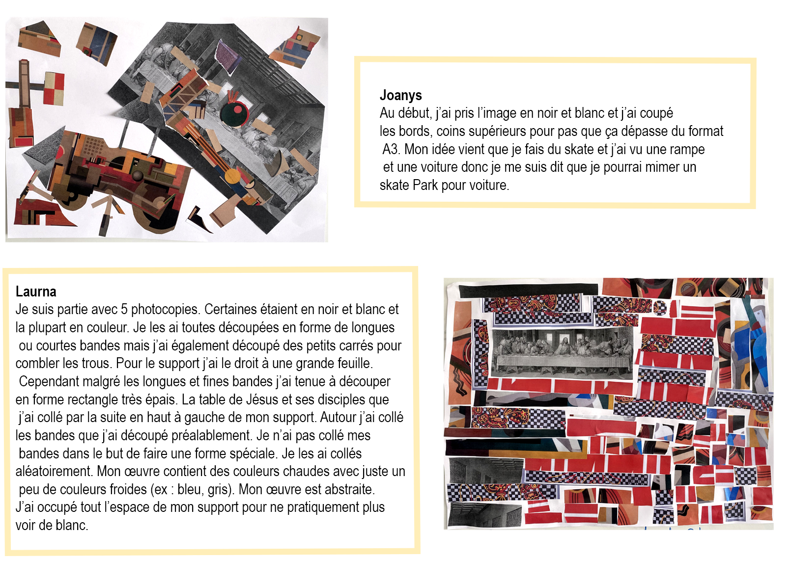 La référence initiale apprait ici et là. Elle reste comme un souvenir, est parfois enfouie parmi des strates de papier, de gestes, de superpositions, de débordements et de déchirures. La référence est de nouveau en mémoire. Il est à noter que trés peu d'élève ont découpé ou caché La Cène.