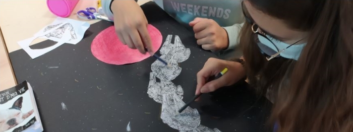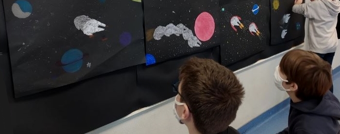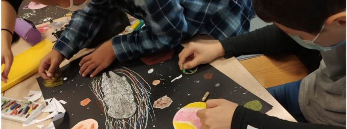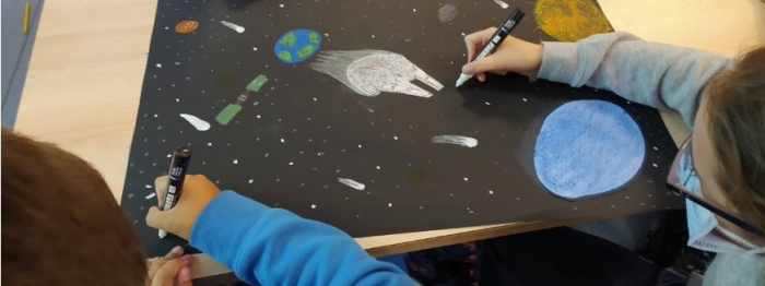 | Les élèves sont amenés à expérimenter et assimiler les représentations possibles de la vitesse en une image fixe. Ils doivent travailler à deux et partager leurs idées. Ils choisissent les outils et matériaux pour travailler en grand format en organisant un espace afin de traduire le mouvement. Très vite, les questions sur la possibilité de faire ressortir des formes sur un fond noir sont échangées et les réponses semblent variées d’un groupe à l’autre. Suite à quelques demandes, du papier machine blanc leur est alors fourni pour réaliser les autres éléments de la scène en collage. |