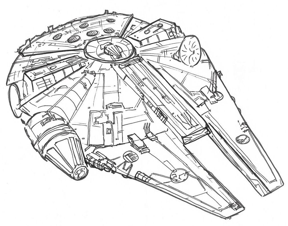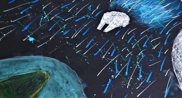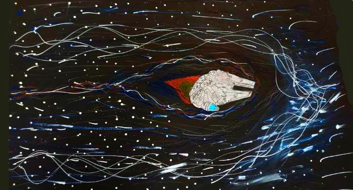 | En début de séquence, les élèves sont invités à se questionner sur les possibles représentations de la vitesse en une image fixe. mais également sur la formule de la vitesse en physique chimie, v=d/t et une représentation du plus célèbre vaisseau spatial de la saga Star Wars. Le choix de faire ce rapprochement avec leurs cours de physique chimie permet de bien orienter les élèves vers les questionnements liés aux deux notions d’arts plastiques, l’espace et le temps. Le Faucon Millenium, vaisseau phare de Star Wars, icone de la pop culture, est bien connu des élèves, il leur permet de saisir intuitivement et immédiatement l’objectif de la séance. |