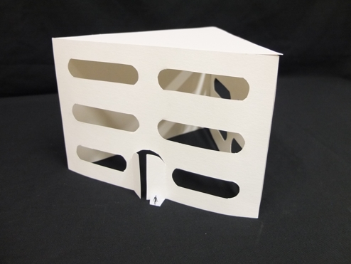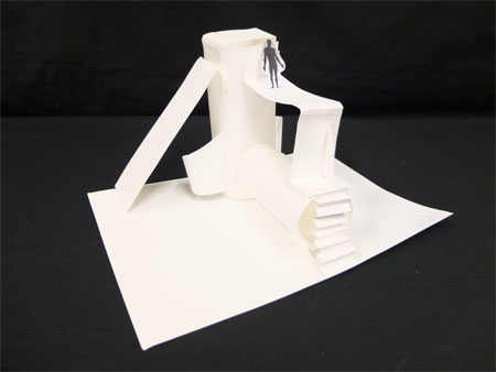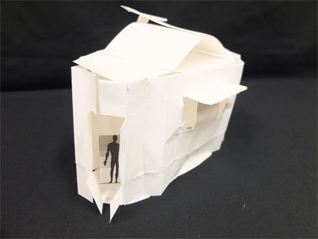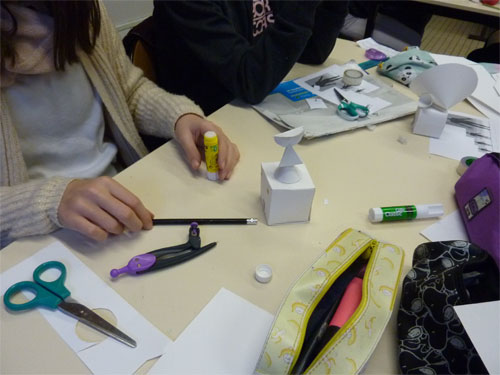 Ils seront amenés à construire une maquette, très simple, qui les fera expérimenter le travail en trois dimensions, les façons d'assembler, de faire tenir debout un matériau qui de prime abord est plat et peu rigide: des feuilles de dessin. Ce sera un moyen de voir leur capacité à fabriquer un volume, à concrétiser une forme à laquelle ils auraient pensé préalablement ou à se saisir de l'imprévu (une manipulation, un pli qui ferait naître une forme qu'ils n'auraient pas imaginée). Chaque élève a bien sûr des connaissances, des références ou des images préalables, qui lui sont propres, et chacun sera plus ou moins à l'aise pour trouver une forme qui s'éloigne de l'habituel cube au toit pointu.