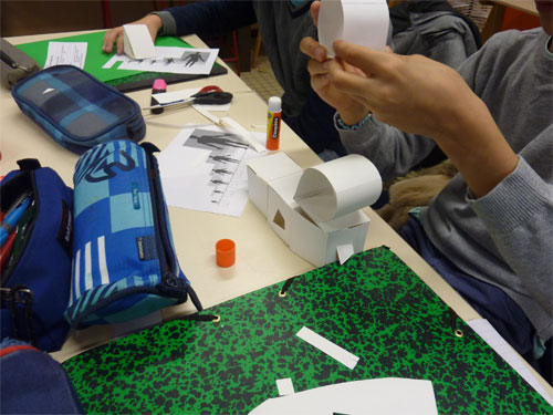 Cette fabrication devrait conduire les élèves à s'interroger sur la forme, la structure et les ouvertures. La question de l'échelle est au début volontairement mise de côté pour simplifier les choses et leur permettre de se concentrer vraiment sur la forme, sans être enfermé dans une quelconque narration qu'induirait un personnage.