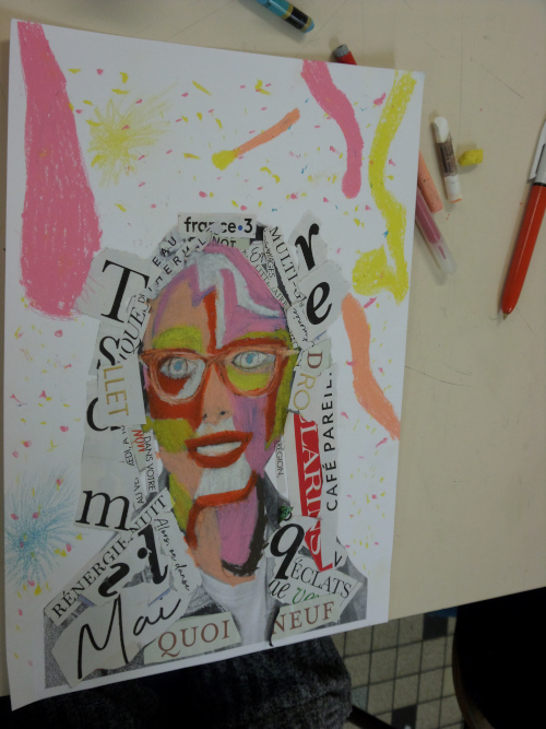 Cette séance vient après une première réflexion de la classe sur le terme d'autoportrait. Restent de celle-ci les pistes suivantes: se dessiner, une représentation de soi, le visage, l'image, parler de soi, le selfie, le portrait chinois. Que pourrait avoir de surprenant un autoportrait? Parmi les réponses proposées par les élèves, figurent une forme de décalage, une déformation, certaines oeuvres de Picasso, la couleur en dehors du ton local, l'invention d'un motif, de matériaux singuliers.