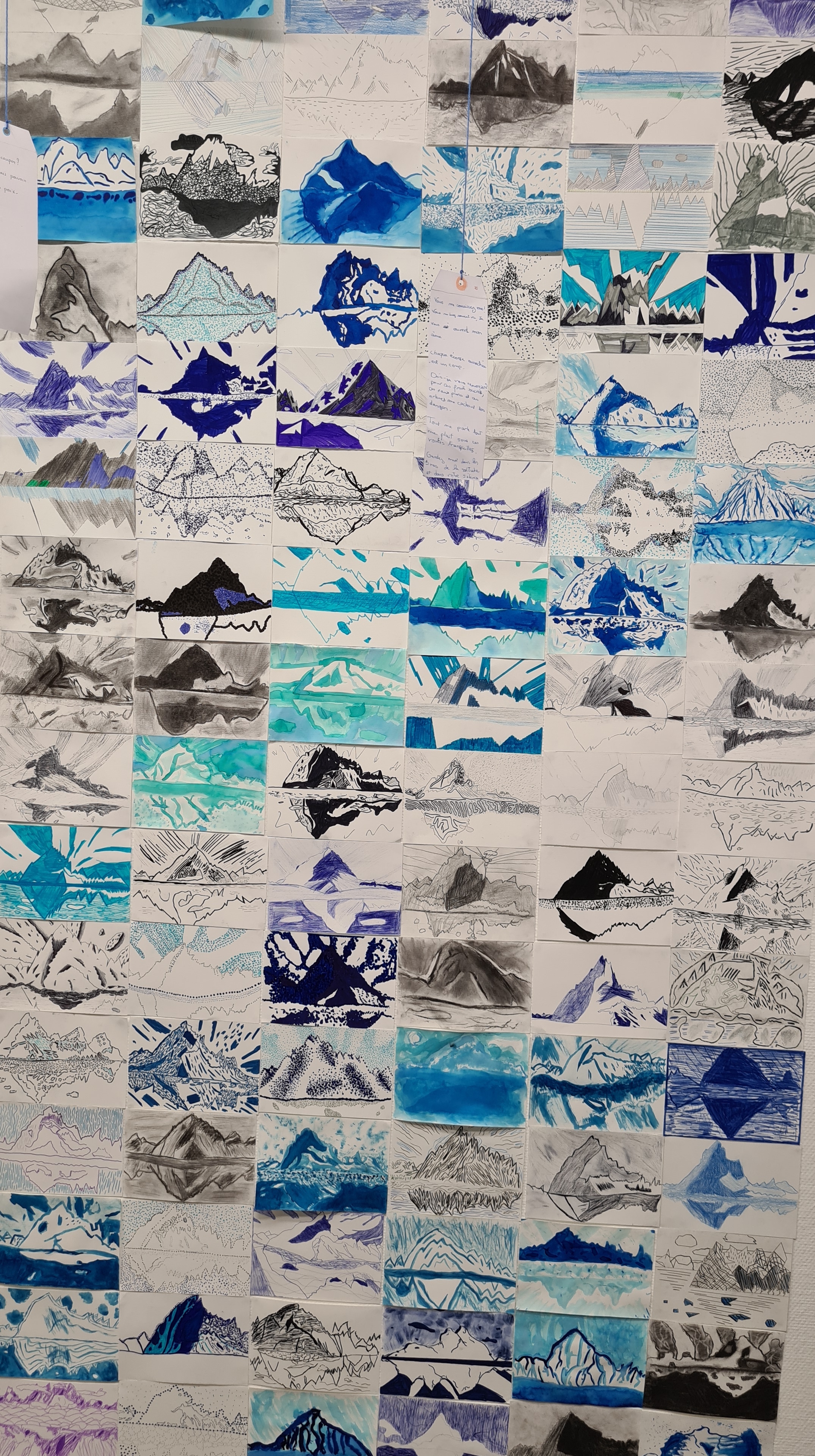 Ces différentes façons de représenter sont l’occasion d'interroger les multiples manières de dessiner et d’exprimer des écarts sur un sujet similaire : ici, une montagne, du bleu, des nuances, de la neige, des reflets, des ombres, des lumières, la roche, la végétation …