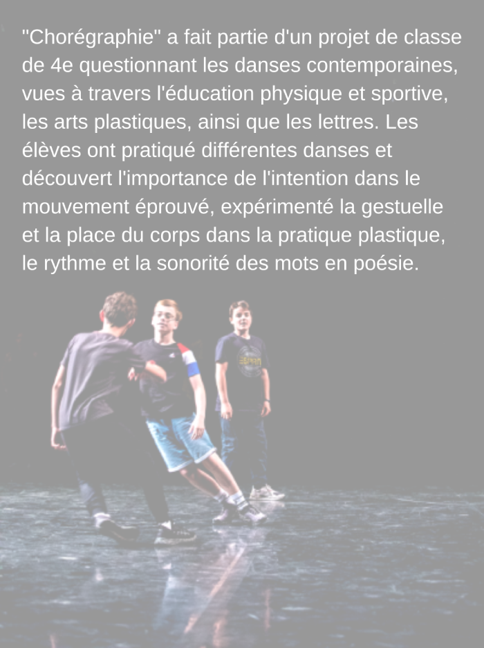 | Les ateliers de pratique de la danse et les spectacles ont été appréhendés en EPS et en arts plastiques, tandis que les élèves ont été amenés, en cours de français, à écrire des textes à réciter en slam lors de deux représentations de fin d'année. Le rythme du texte avait un impact sur la danse. Lors de ces deux représentations, au théâtre Interlude à Cholet et au théâtre Le Quai à Angers, ils ont donc dansé, slamé et proposé un visuel réalisé en cours d'arts plastiques. Ils ont également participé à un bord de scène afin d'échanger avec les autres collégiens du département ayant participé à cet itinéraire. | |||