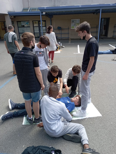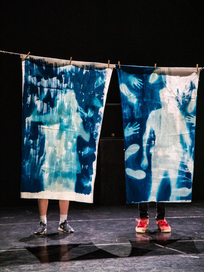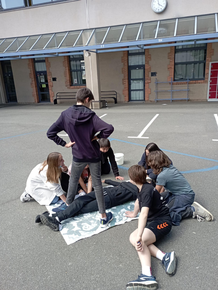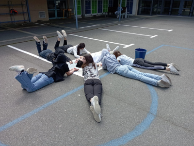 | La classe, composée de trente élèves, a été divisée en quatre groupes. Chacun de ces groupes avait pour contraintes de travailler la technique du cyanotype sur un support en tissu de coton épais d'environ 1 mètre sur 70 centimètres. Le travail a été produit sur deux séances. La première nous a permis d'appliquer le mélange de citrate de fer ammoniacal et de ferricyanure de potassium sur les supports en travaillant le geste en toute conscience, avec des choix plastiques à verbaliser, et de découvrir les références artistiques liées à ce médium. Lors de la seconde séance, les élèves ont posé leurs corps sur les supports, dans la cour du collège, afin de figurer des mouvements. Après avoir rincé les supports abondamment et en partie dans une eau comprenant du vinaigre blanc pour arrêter le processus chimique, nous les avons mis à sécher et nous avons pu voir les résultats apparaître. Le procédé employé ici, avec sa part de révélation, revêt une part de magie aux yeux des élèves. | |||