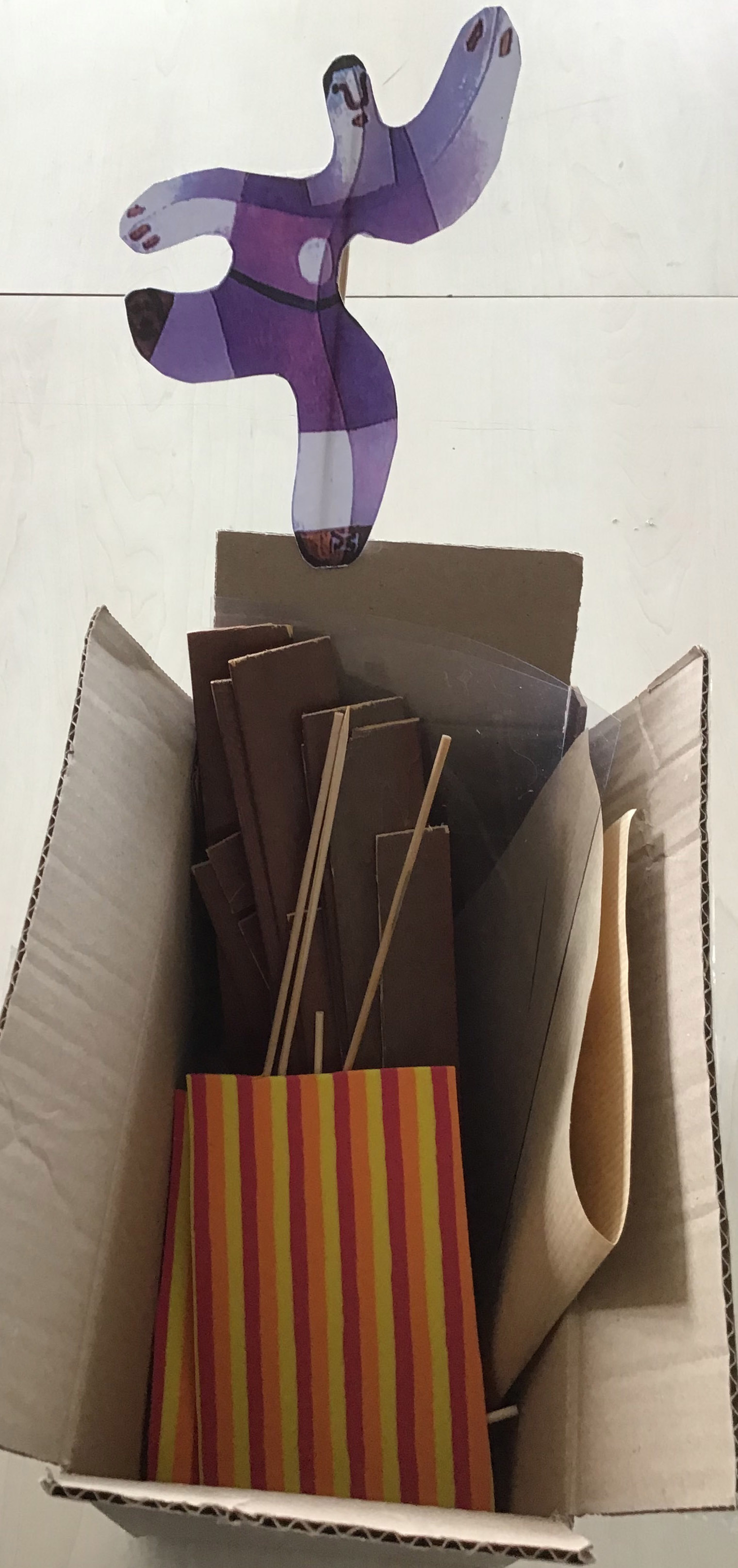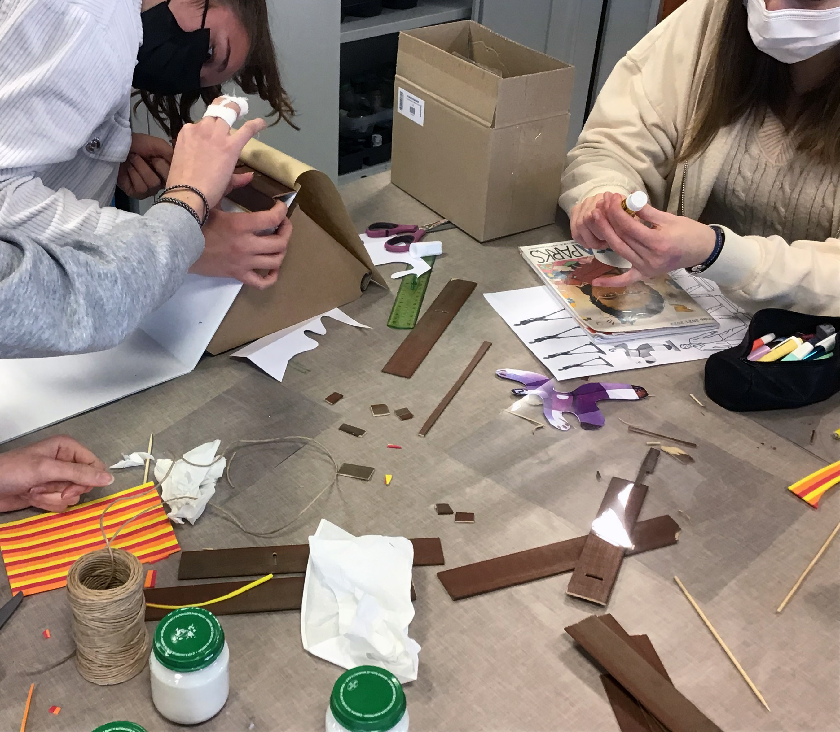 Ils sont par groupe et disposent de pics à brochette, d’un fragment en papier kraft, d’un carré de mousse colorée, de divers modules de bois, de colle liquide, de formes en carton, d’autres en plastique transparent semi rigide, de la fibre tissée.