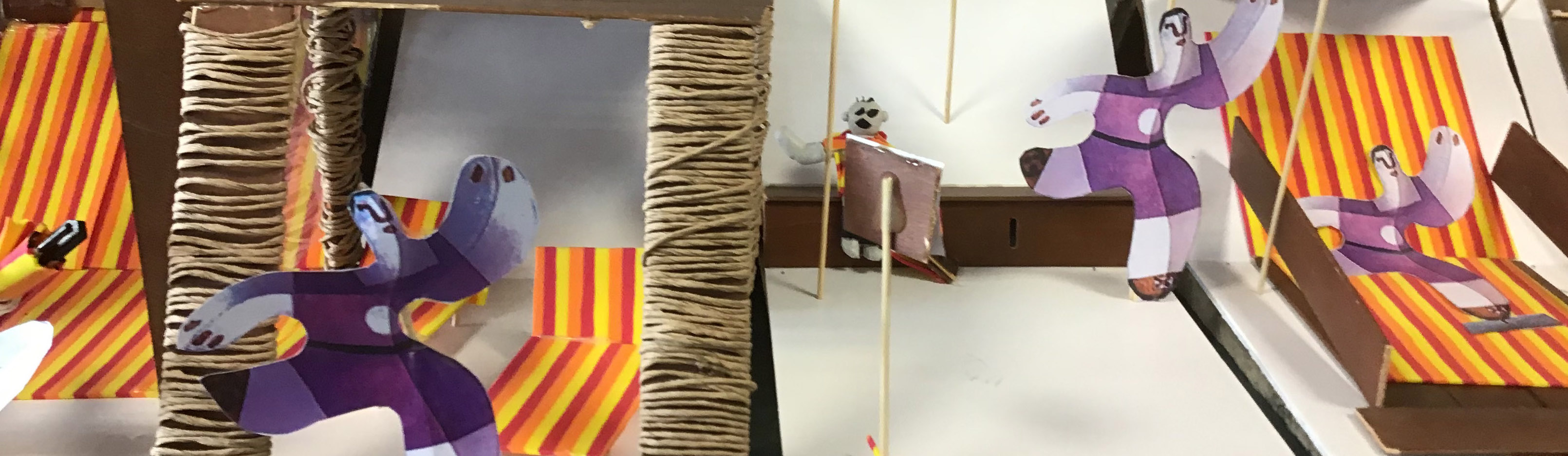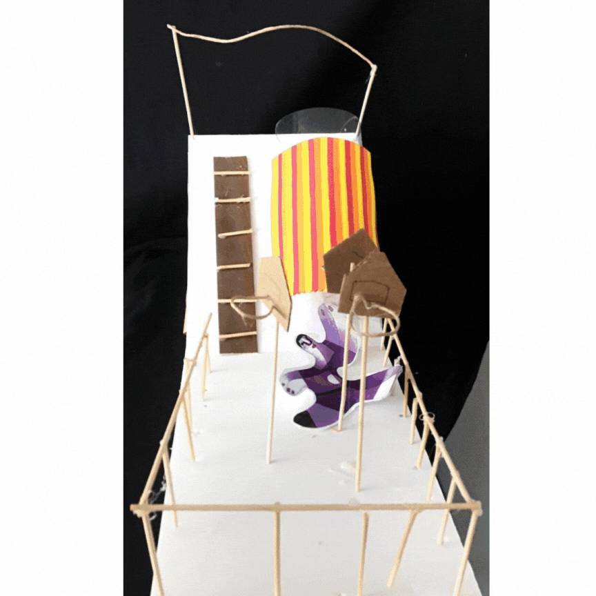Un plan incliné en carton matérialise la butte. Un personnage de papier permet de donner une certaine échelle.
