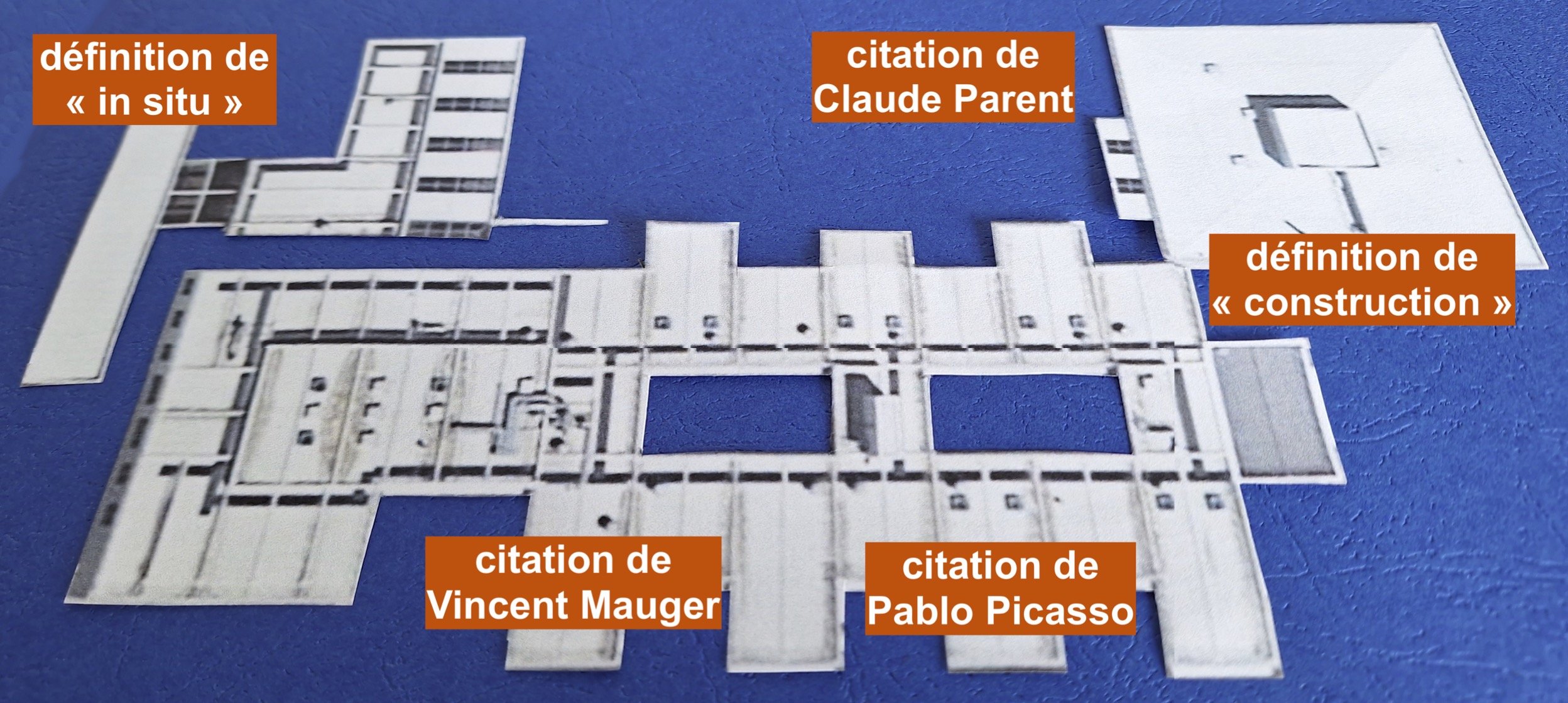 Les opérations plastiques effectuées par Pablo Picasso invitent à réfléchir sur le pli. Vincent Mauger exploite les potentialités du matériau qui va guider ses choix. Il propose un dialogue entre l’espace et l’oeuvre. Un espace est un lieu plus ou moins bien délimité dans lequel on peut se situer, et dans lequel l’architecture s’inscrit. Claude Parent nous propose un regard oblique sur l’architecture et fait l’éloge de la pente comme d’un tremplin, nous invite à appréhender l’espace de façon dynamique. En croisant cette lecture avec la volonté de travailler avec l’espace du collège, son dedans (une architecture modulaire), son dehors (une cour qui est fermée sur le fond de parcelle par un talus végétalisé).