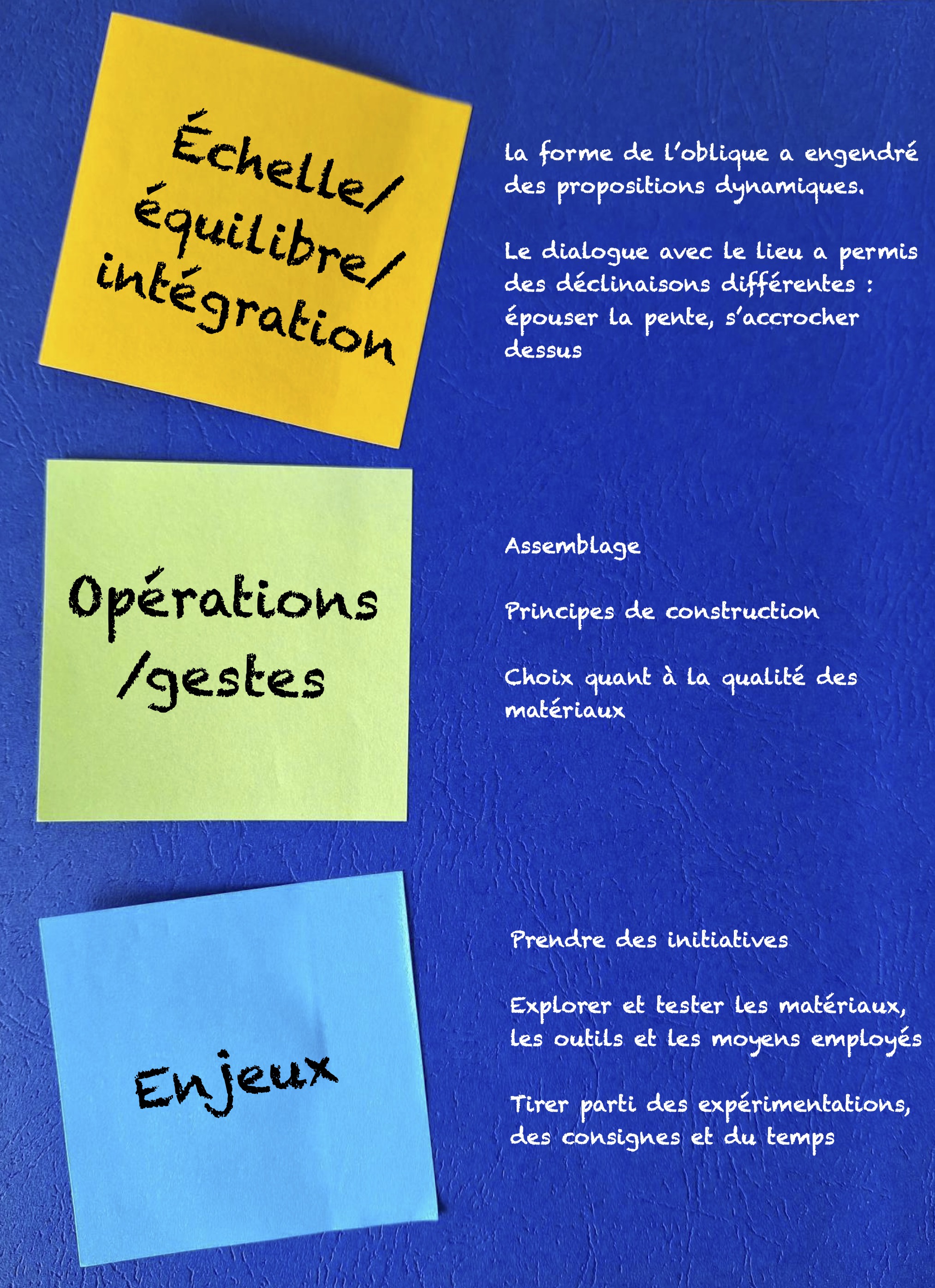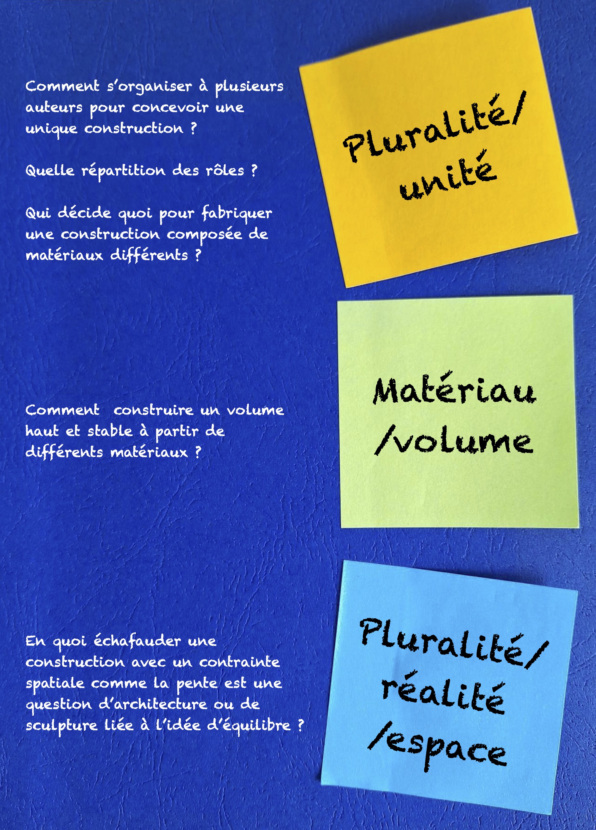 La séquence imaginée propose une approche sensible de l’espace, de sa perception à sa construction. Trois axes de réflexion se dessinent. Il s’agit donc d’inviter les élèves à questionner la matérialité d’une construction et le dialogue qu’elle instaure avec l’espace où elle s’inscrit.
