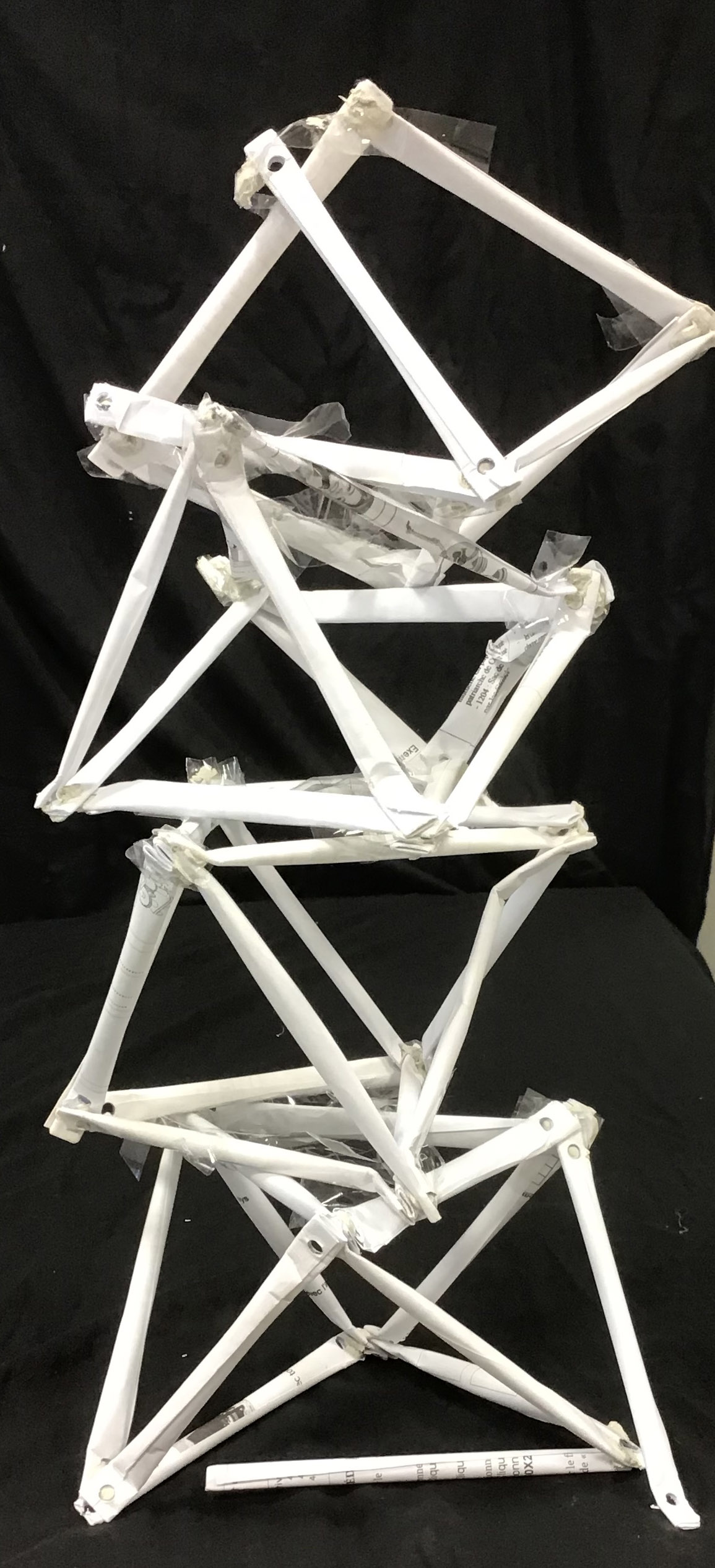 Ce travail vise à questionner la notion de structure et de son équilibre, à l’épreuve de la matérialité. Travail par groupe de 4. Chaque groupe reçoit 50 bâtonnets papiers, patafix et scotch.