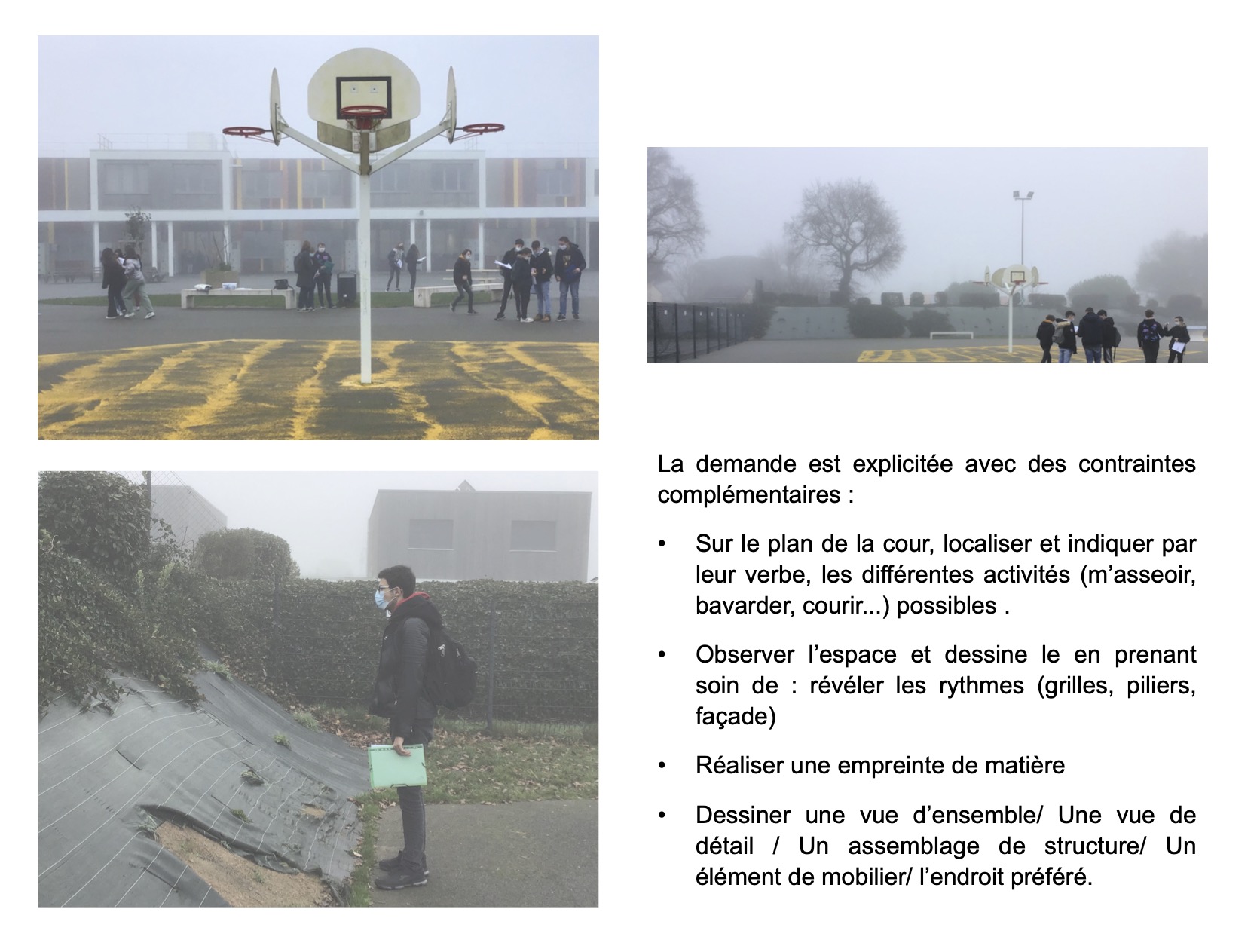 La question de l’in situ a déjà été abordée en début d’année pour une proposition autour de l’espace du hall du collège. Ici le rapport avec l’extérieur est intéressant car cet espace est un enjeu d’occupation de territoire. Ici on questionne l’espace comme espace vécu. Il s’agit de questionner la dimension symbolique et culturelle de cet espace : le fond de la cour du collège. L’enjeu de la matérialité peut aussi avoir un rôle dans les assemblages proposés par les élèves: