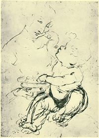 repentirs, visibilité du processus de création, effacement, recouvrement, traces, représentation du mouvement ![]() madone et enfant avec coupe de fruits dessin à la plume sur croquis à la pointe 35X25 cm Musée du Louvre |