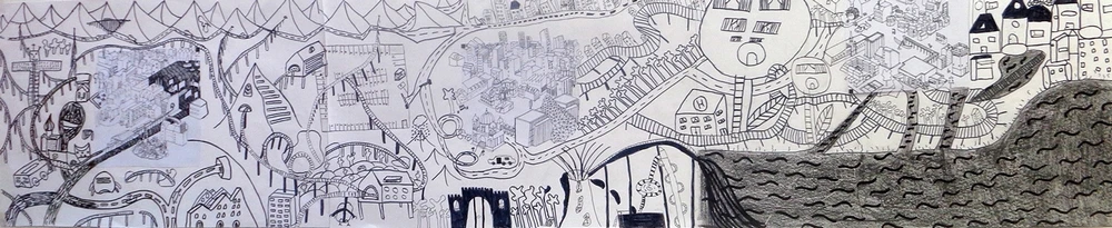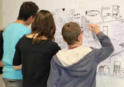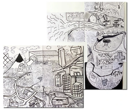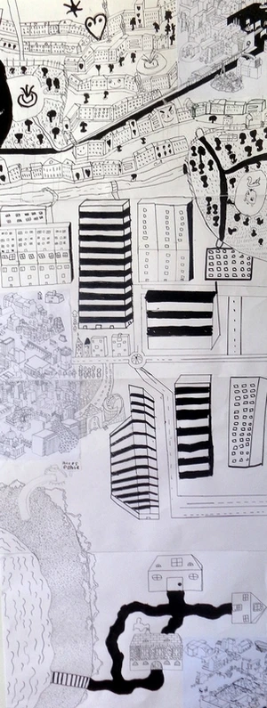 Les élèves se mettent en équipes, constituées grâce aux numéros de leur fragments, et trouvent des solutions pour combiner leurs premier travail, tant sur le plan de la signification que de celle des formes et de l'espace.