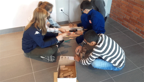 Pour gagner du temps, 6 boîtes sont distribuées aux élèves. Elles contiennent toutes environ 35 modules en bois qui ressemblent à un jeu de construction très connu des élèves. Ils sont accompagnés d’un pistolet à colle, d’une feuille sur laquelle 3 compétences et leurs échelles descriptives sont photocopiées, d’un crayon de bois et d’une tablette en bois qui pourra servir de support si nécessaire.