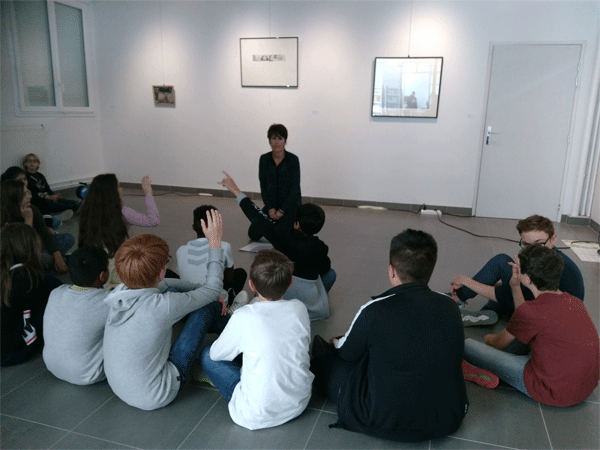 La production doit impérativement être amovible. Une photographie sera prise par le groupe à la fin de la séance. La galerie de notre établissement accueille, en cette première période de l’année, sa première exposition de l’année scolaire qui s’intitule « Écho(s) ». Elle regroupe 5 œuvres empruntées à l’artothèque d’Angers que les élèves découvrent à leur arrivée dans la galerie. Le choix de celles-ci a été réalisé pour s'articuler à la demande des élèves.