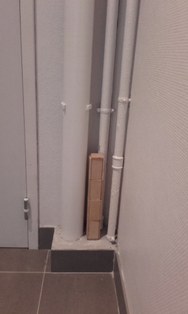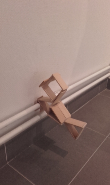 "Notre production est installée directement sur les tuyaux des radiateurs de la salle d'exposition. Notre construction a été construite pour s'emboîter dessus. C'est du "sur mesure"! Comme tout est emboîté, nous n'avons pas eu de problème d'équilibre." Malo, Bryan, Mathéo, Eva