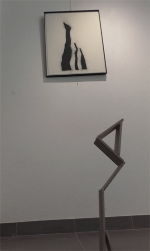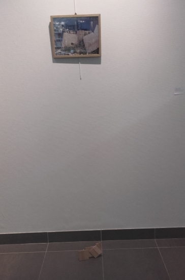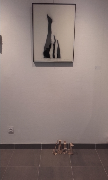 "Notre production peut être considérée comme in situ car elle est en lien avec l'oeuvre qui est juste au-dessus d'elle. Nous avons décidé de faire une sculpture qui a les mêmes formes que les morceaux de bois que l'on voit sur l'image. Pour que cela tienne en équilibre, nous avons collé un morceau de bois à l'arrière."