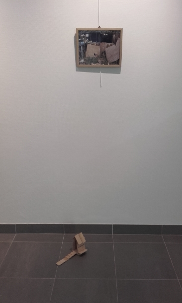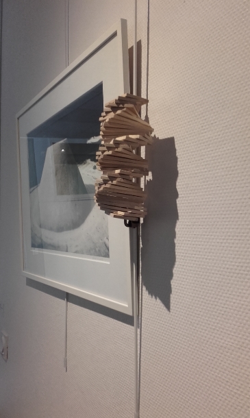"Notre production est in situ car elle est en lien avec la photographie qui est juste à côté d'elle. Nous avons collé notre production sur une cimaise, à la même hauteur que l'image. Le spectateur pourra imaginer que c'est un escalier qui permet de grimper sur le cône. Même si on a une image d'un côté et une sculpture de l'autre, on peut tout de même s'imaginer une histoire."