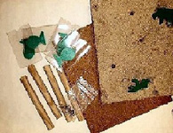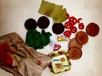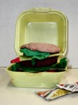 Notre kit est un trompe l'oeil. Il s'agit d'un faux hamburger. On a moulé toutes les pièces dans de l'argile qui durcit à l'air, en leur donnant une forme qu'on peut empiler dans un certain ordre. On a aussi récupéré une coque spéciale. On présente le tout comme un vrai, dans un sac de kraft, avec serviette en papier et ticket de caisse.