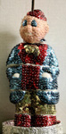 On a travaillé dans un bloc de polystyrène en le râpant pour avoir une forme de bonhomme. Ensuite, on a tranché horizontalement pour obtenir plusieurs parties. On a fait un trou au centre de chaque élément pour laisser passer un axe (tige de bambou). Après, on a fait un collage de pastilles brillantes pour habiller le personnage. On a eu bien du mal à faire tenir droit l'axe dans le socle prévu. Pour construire, on enfile les éléments dans l'axe. Il y a plusieurs solutions, comme ça, les autres choisissent.