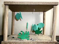 On a pensé assez vite à un aquarium mais on voulait le faire avec des vitres. On n'a pas trouvé de solutions pour assembler les cotés sans les coller définitivement, alors on a gardé juste une structure en bois. On a vissé les différentes pièces. Les éléments qui "flottent" dans l'aquarium sont tenus avec des fils nylon qui descendent par de petits trous faits dans le plafond. Ils sont retenus par des petits taquets. dim: 37 x 42 x 35 cm