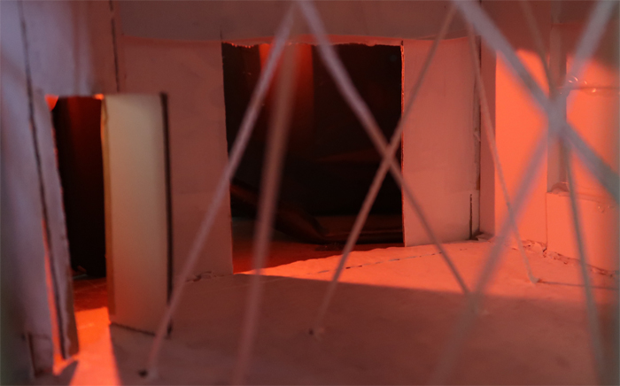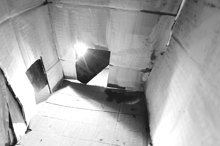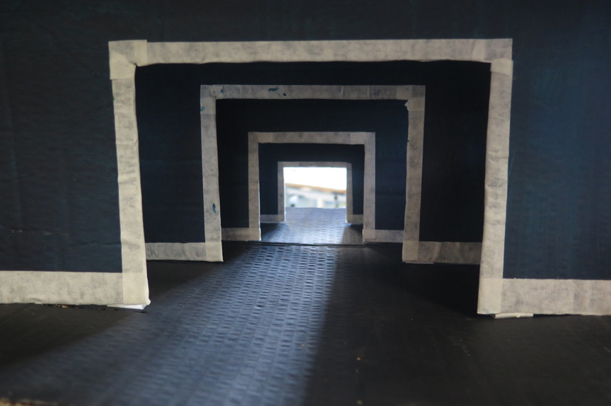 Le sujet consistait à fabriquer une maquette en faisant passer la lumière à l’intérieur et prendre la scène en photo. J’ai représenté un couloir, avec l’idée d’un couloir sans fin, où il n’y aurait presque pas de luminosité, seulement au bout du couloir. J’ai fabriqué des ouvertures, de la plus grande à la plus petite, pour donner une impression de profondeur. J’ai réalisé ma maquette avec des morceaux de carton que j’ai mesuré de la taille voulue, puis assemblés. Par la suite j’ai peint les murs et ajouté du scotch pour marquer les ouvertures. J’ai laissé une ouverture au bout de la maquette pour faire entrer la lumière dans l’espace ainsi que sur les côtés pour faire entrer la lumière de différentes manières.